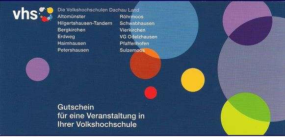 Überraschen Sie jemanden mit einem Gutschein für eine Veranstaltung bei einer der Volkshochschulen Dachau Land und Region e.V. Der Gutschein kann in beliebiger Höhe bei einer der nachfolgenden Volkshochschulen gekauft werden und bei jeder dieser Volkshochschulen eingelöst werden: